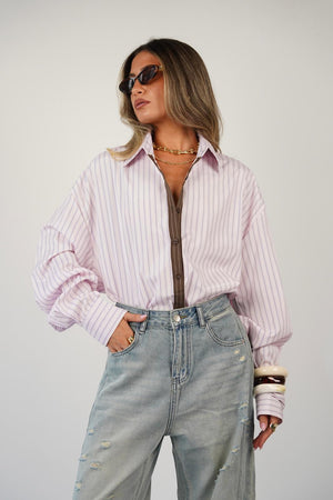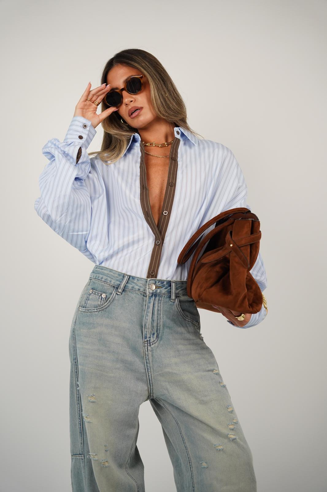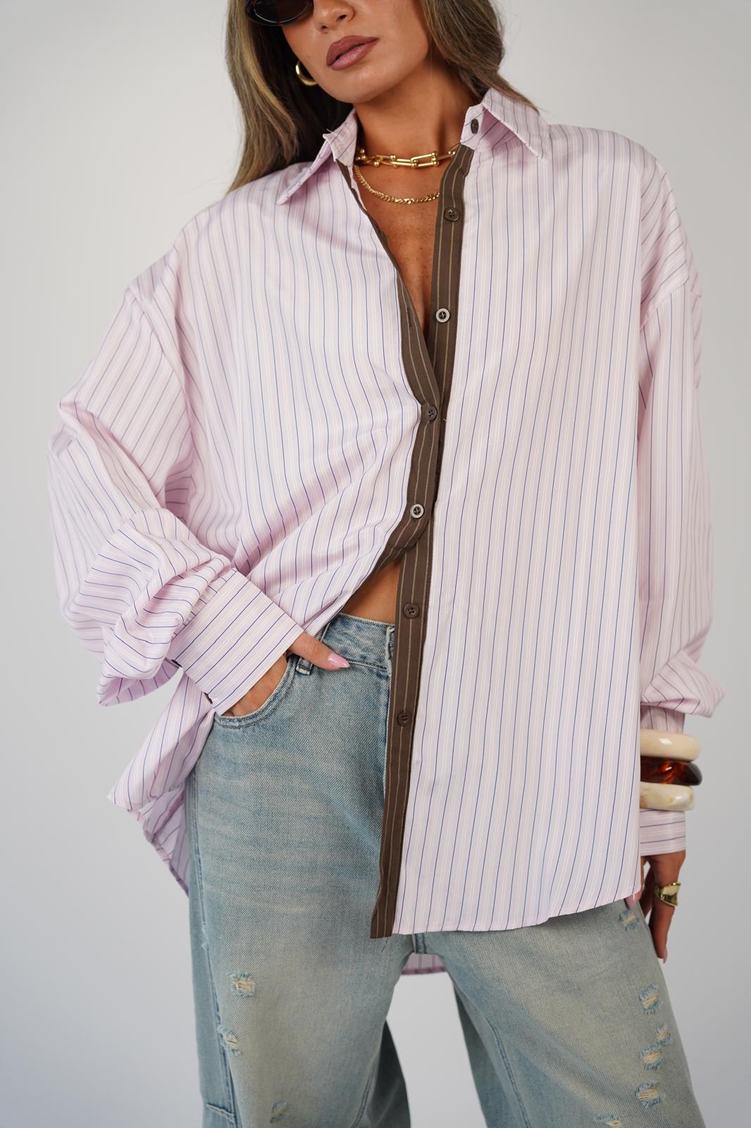 חולצת פסים מכופתרת עם שילוב של שינה בצבע חום