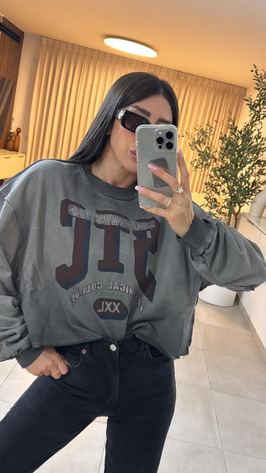 חולצה בגזרת אוברסייז קצרה, בגוון אפור דהוי עם הדפס קולג’ בסגנון רטרו בחזית. הבד רך ונראה מעט משופשף, מה שמעניק לו מראה וינטג’י וקליל. השרוולים הרחבים והגזרה המשוחררת יוצרים לוק נינוח ובועט, שמתאים לסטייל רחוב יומיומי עם טוויסט אופנתי