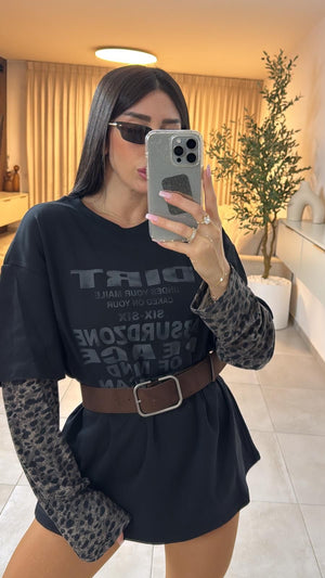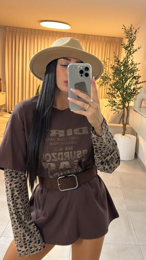 חולצה ארוכה בגזרה אוברסייז עם הדפס קדמי מודפס בגוון טון על טון. השרוולים בעלי שילוב ייחודי של בד מנומר בקצה, המוסיף טאץ’ אופנתי ושובר את המראה הקלאסי. מגיעה עם חגורת עור חומה רחבה לסגירה במותן, שמעצבת את הסילואטה ומעניקה מראה מחמיא ושיקי – ניתן ללבוש כחולצה ארוכה או כטוניקה