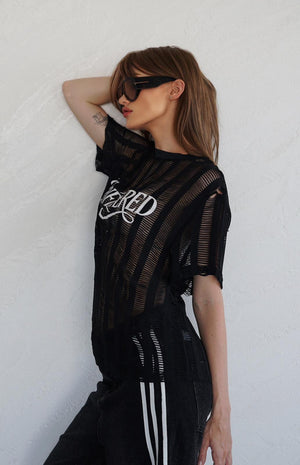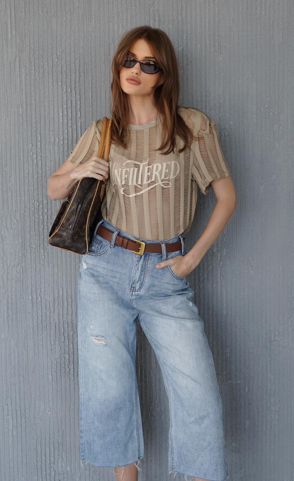 החולצה עשויה בד רשת שקוף בשחור לבן ואבן , עם דוגמת פסים אנכיים ומראה אוורירי ונועז. הדפס לבן עם כיתוב UNFILTERED מוסיף טאץ’ אורבני ובולט. הגזרה המשוחררת יוצרת מראה קליל ומלא סטייל, מושלם לשילוב מעל גופייה או טופ