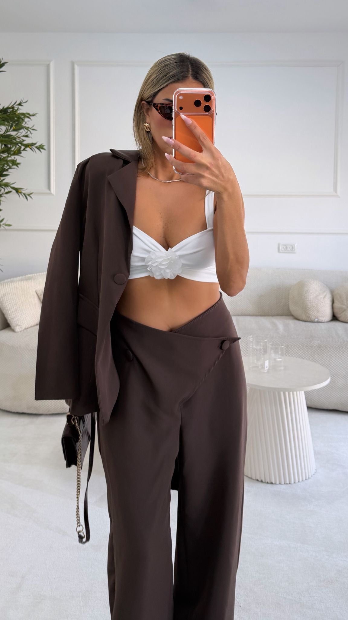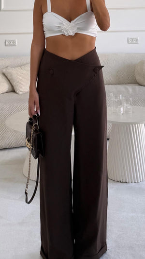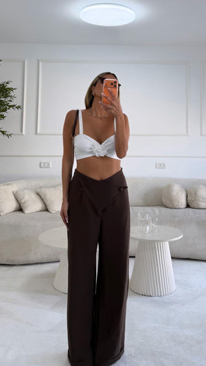 המכנס בגזרה גבוהה ומחויטת, בגוון חום עמוק ומרקם רך ונשפך.