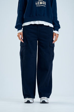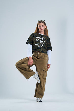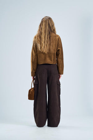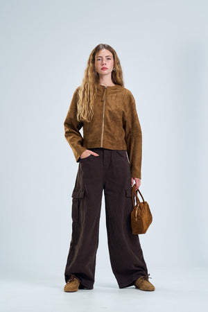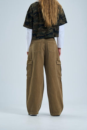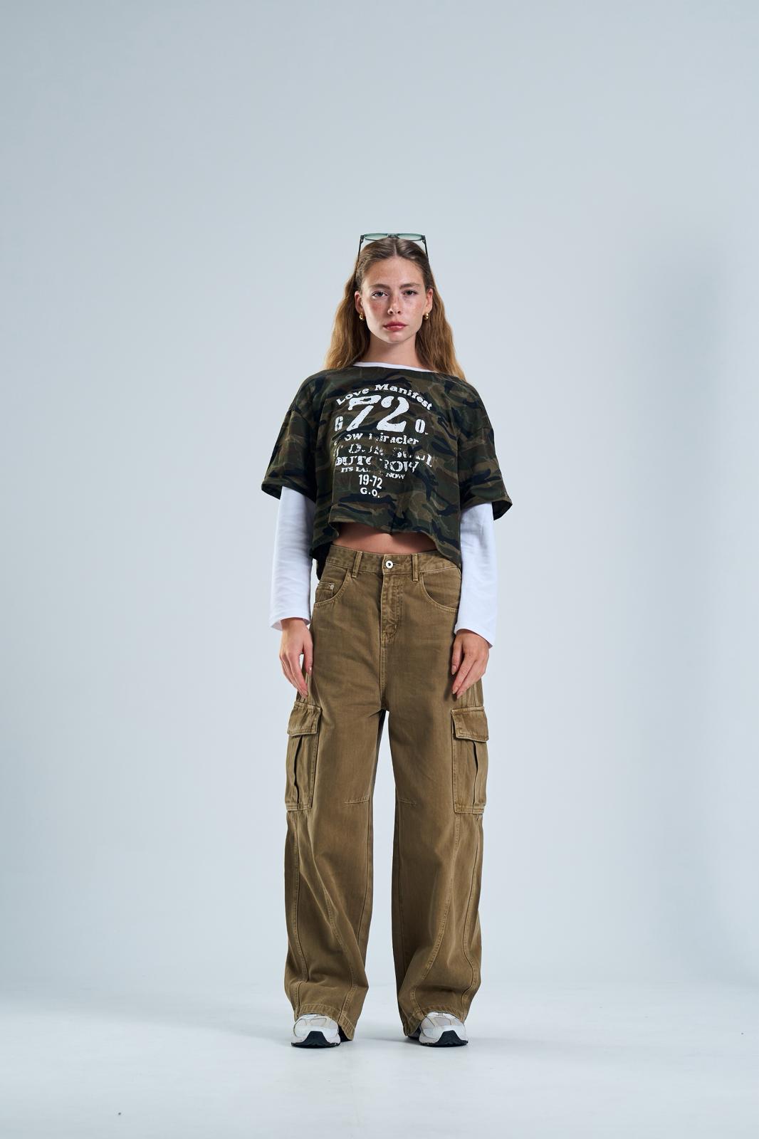 המכנס בתמונה הוא דגם קז’ואלי בסגנון קרגו, עשוי בד עבה במראה דמוי קנבס בגוון חאקי חם חום שוקולד וכחול כהה