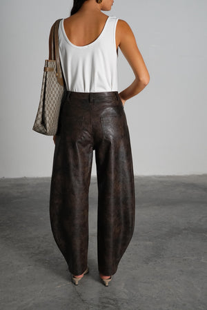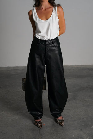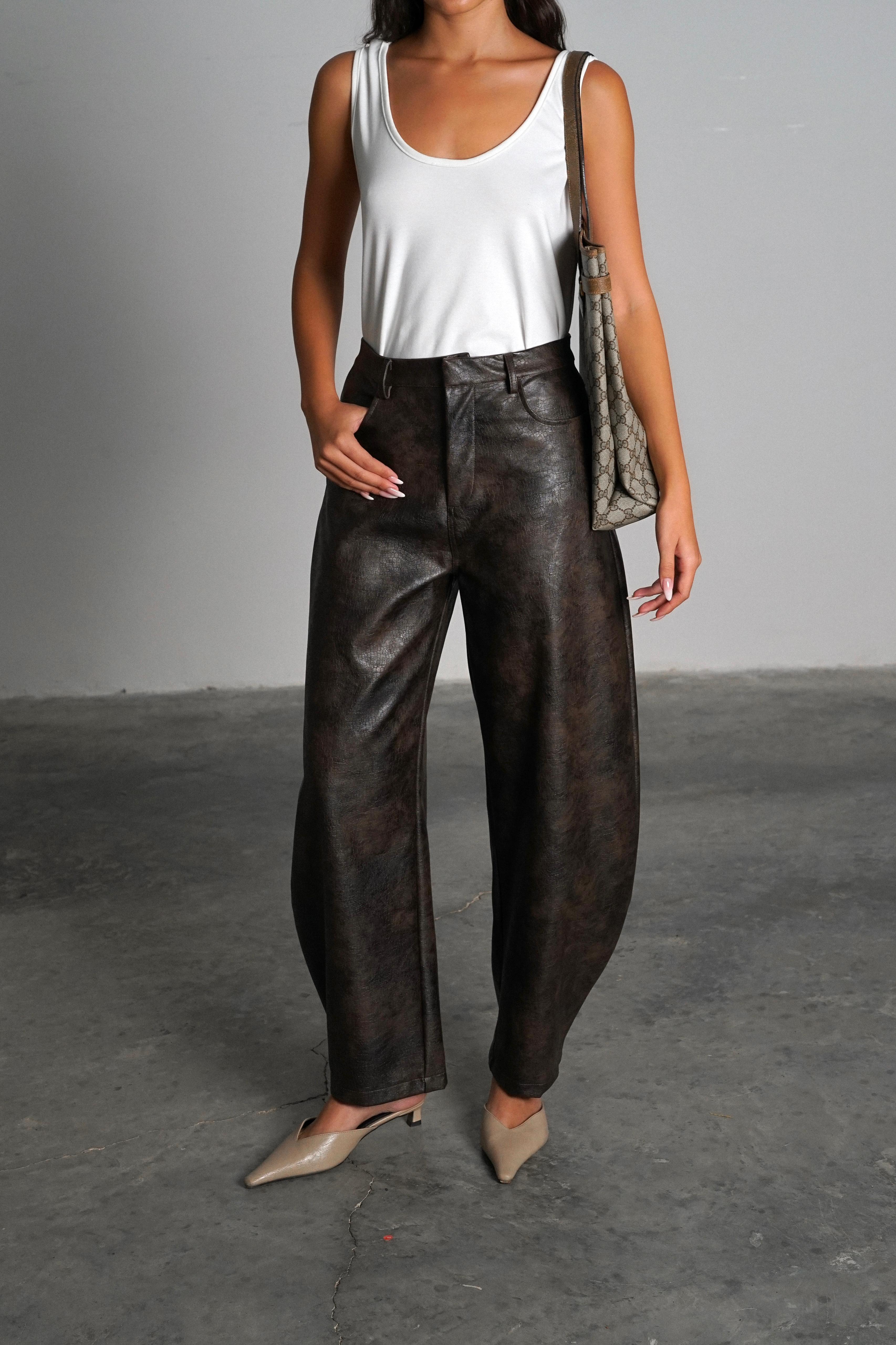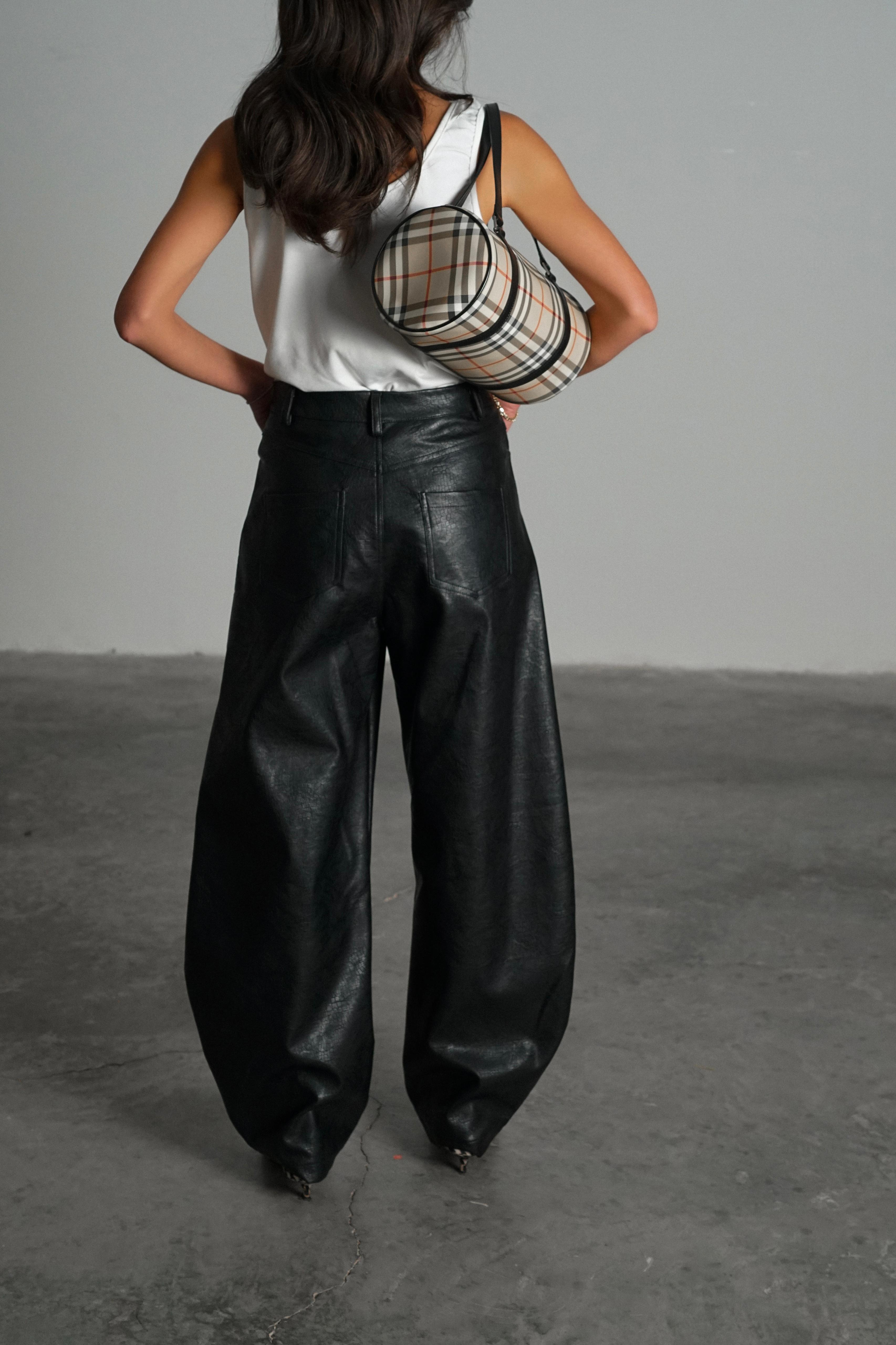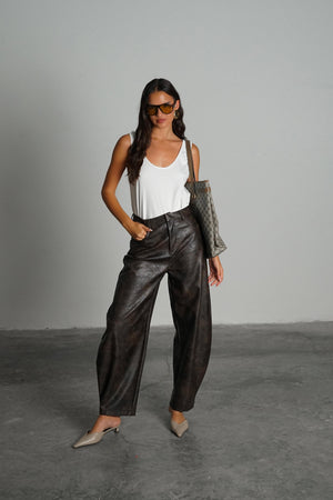 מכנס עור רחב בגזרה גבוהה עם מראה מבריק ומרקם ייחודי, שמעניק לו טאץ’ יוקרתי ואופנתי.
