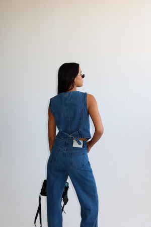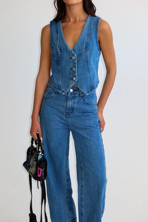 ווסט בסגירת כפתורים מקדימה, מכנסי ג׳ינס בסגירת כפתור ורוכסן