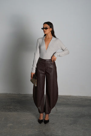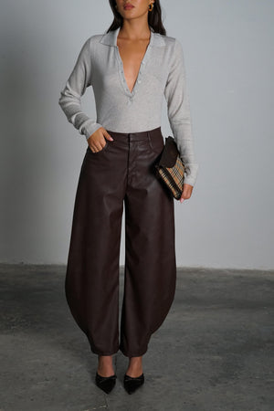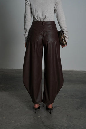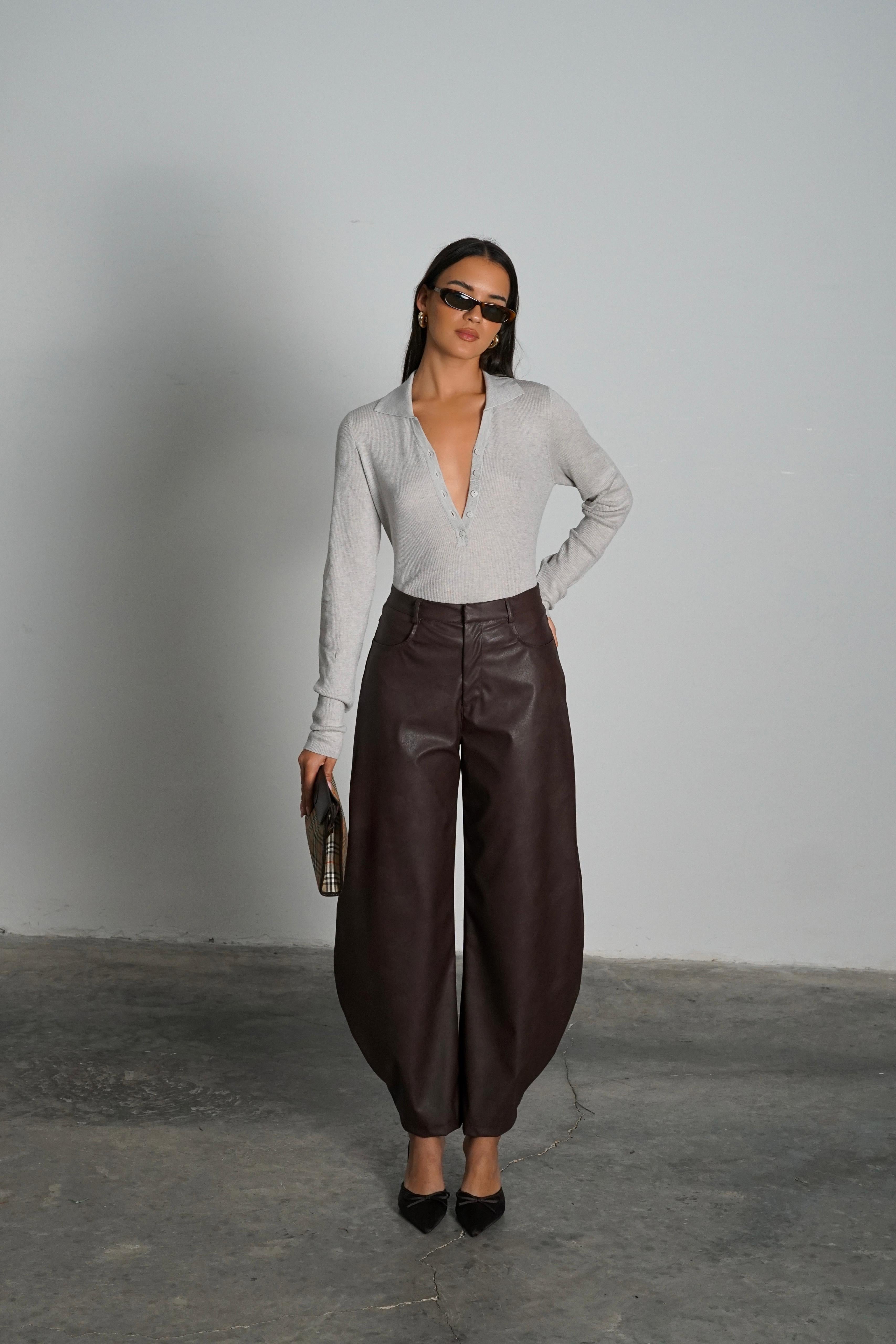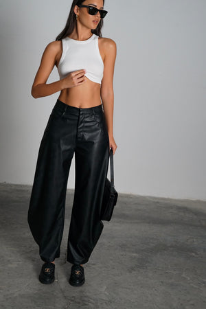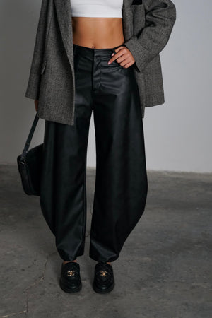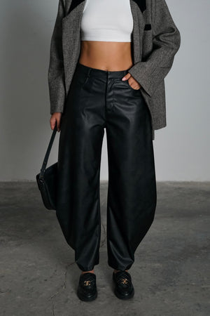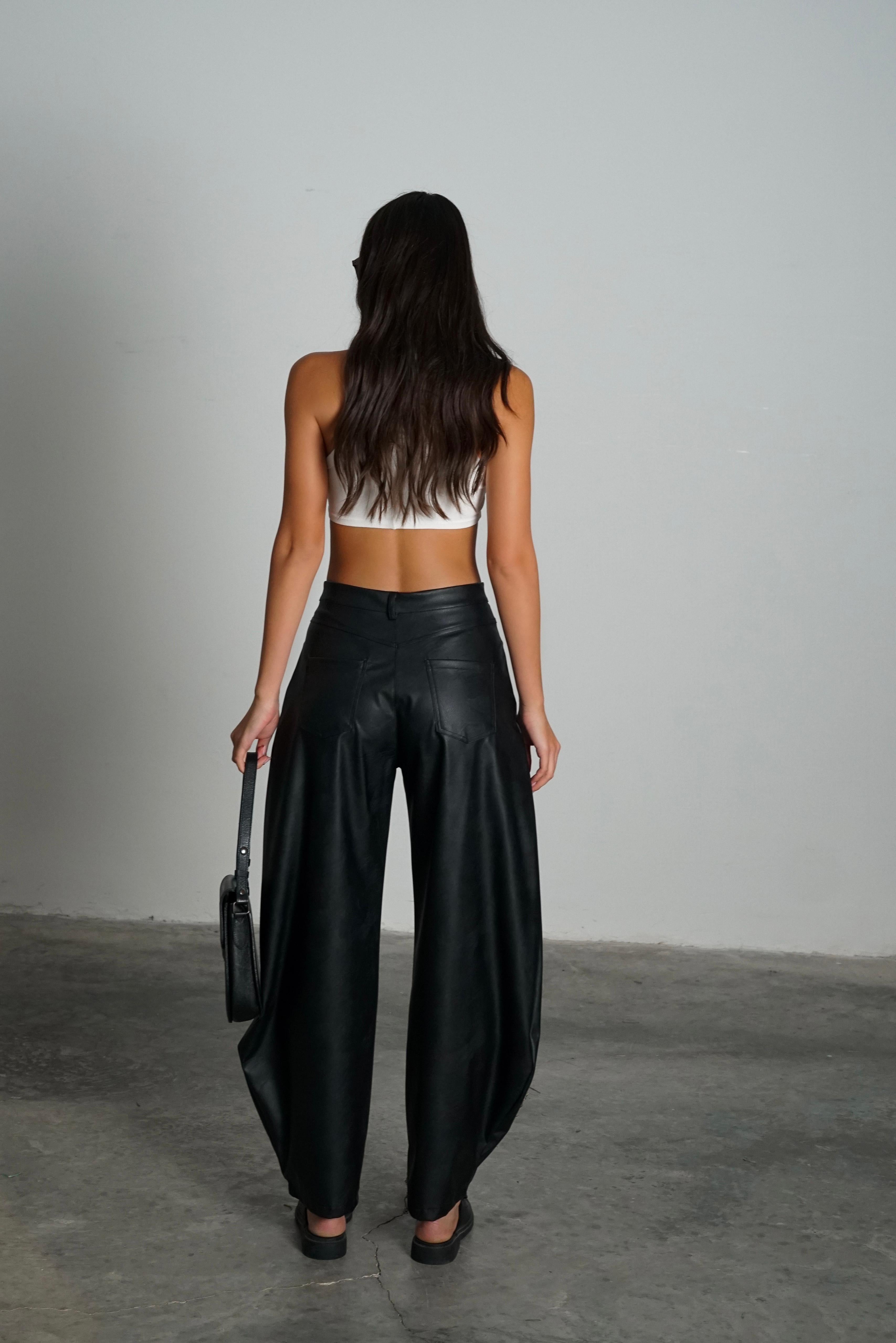 מכנס שחור דמוי עור עם מראה יוקרתי ונגיעה עדכנית.