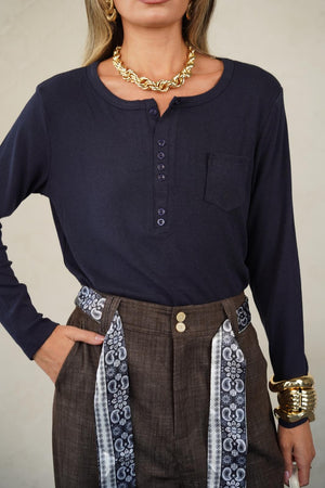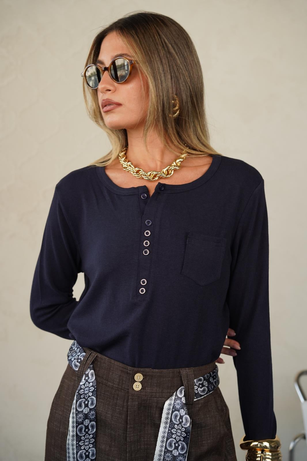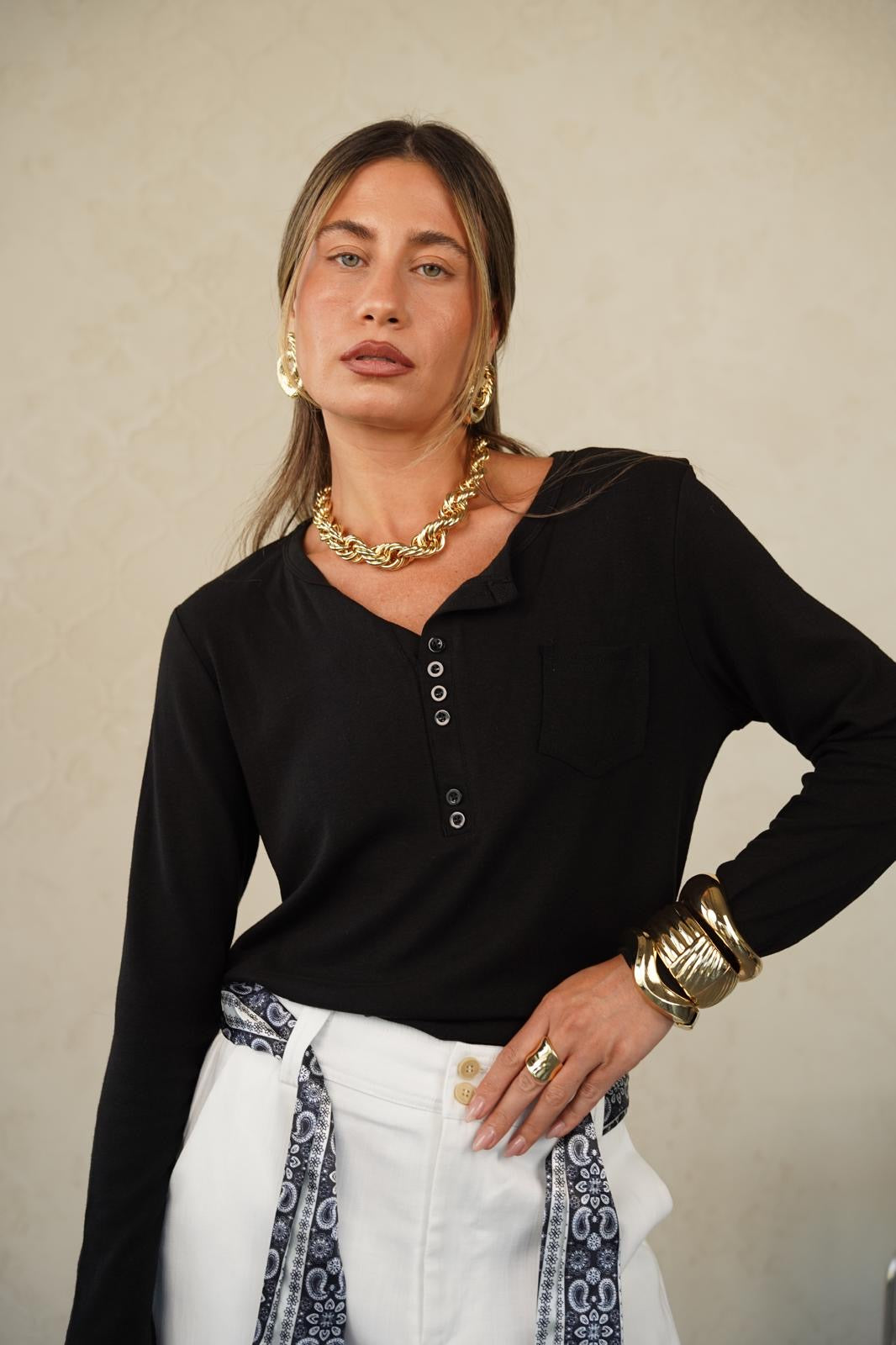 טישרט מבד חלומי ונעים , גזרה ישרה מפתח עגול עם 3 כפתורים וכיס עדין