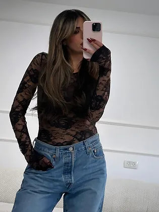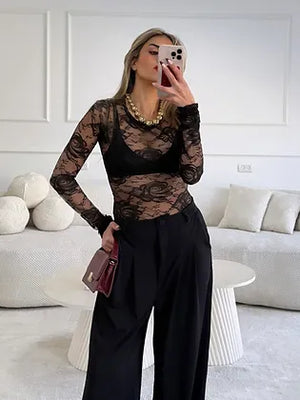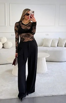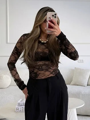 בגד גוף מבד תחרה עם שרוולים ארוכים