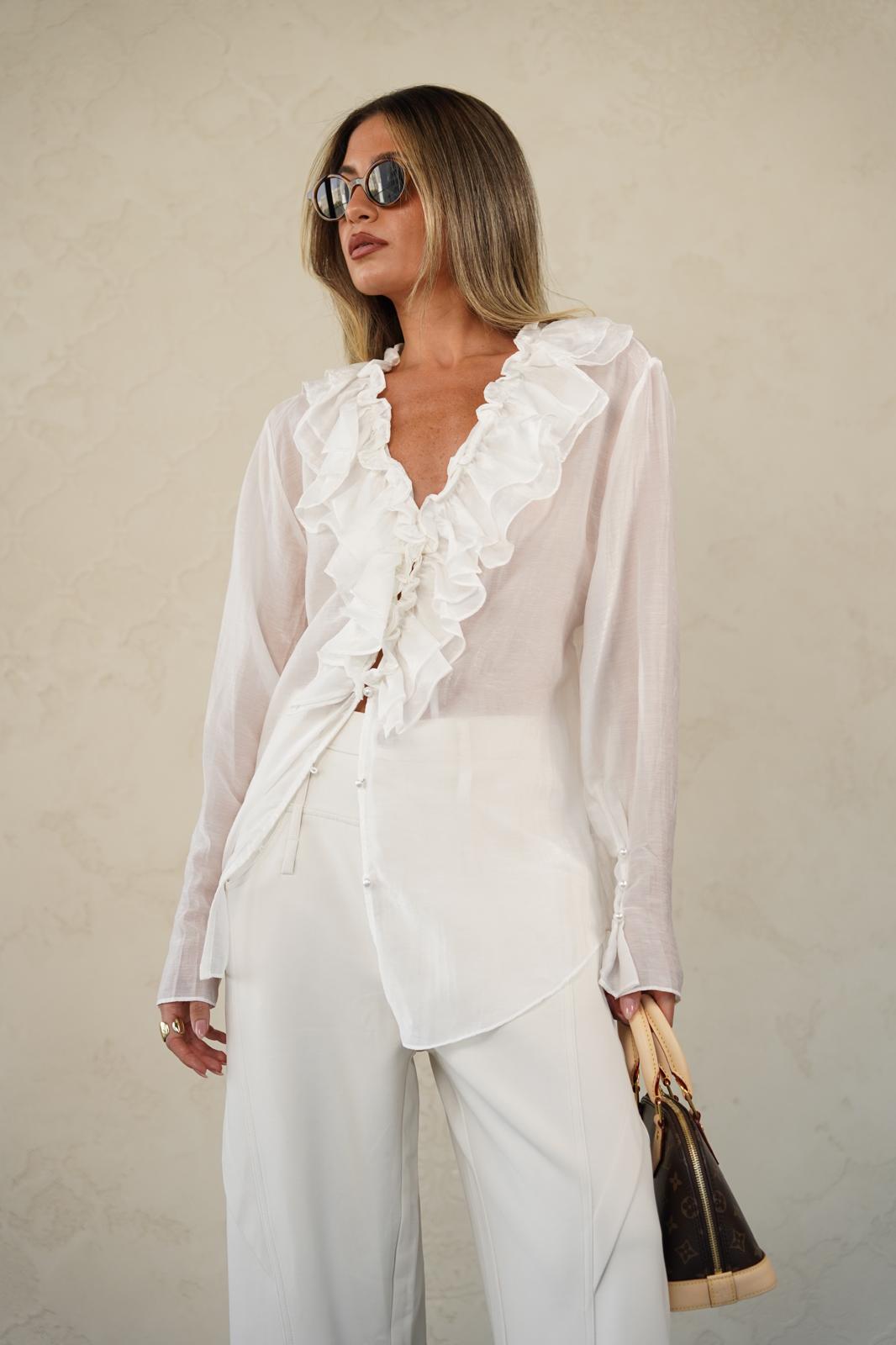 חולצה מכופתרת אוברסייז, מבד עשיר ואלגנטי, מפתח וי עם וולנים , רכיסת כפתורי פנינה בשרוולים