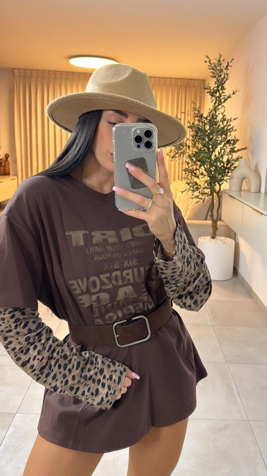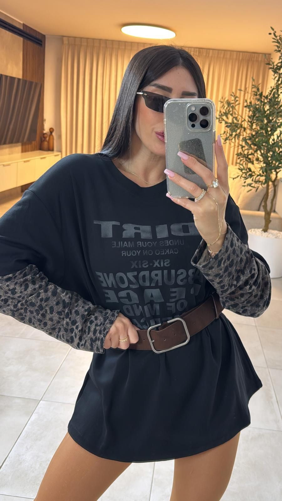 חולצה ארוכה בגזרה אוברסייז עם הדפס קדמי מודפס בגוון טון על טון. השרוולים בעלי שילוב ייחודי של בד מנומר בקצה, המוסיף טאץ’ אופנתי ושובר את המראה הקלאסי. מגיעה עם חגורת עור חומה רחבה לסגירה במותן, שמעצבת את הסילואטה ומעניקה מראה מחמיא ושיקי – ניתן ללבוש כחולצה ארוכה או כטוניקה
