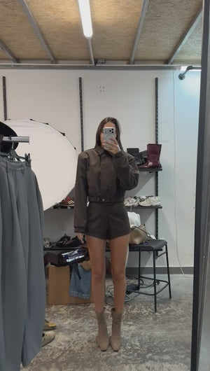 ג׳קט עם גומי במותן ליצירת סילואט מחמיאה, ושורט בגזרה נקייה שמדגיש את הלוק.