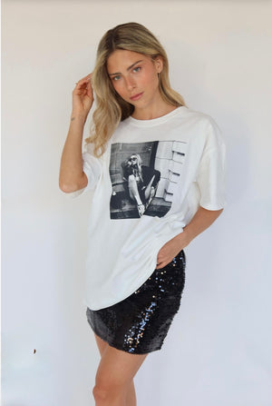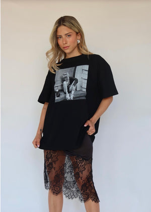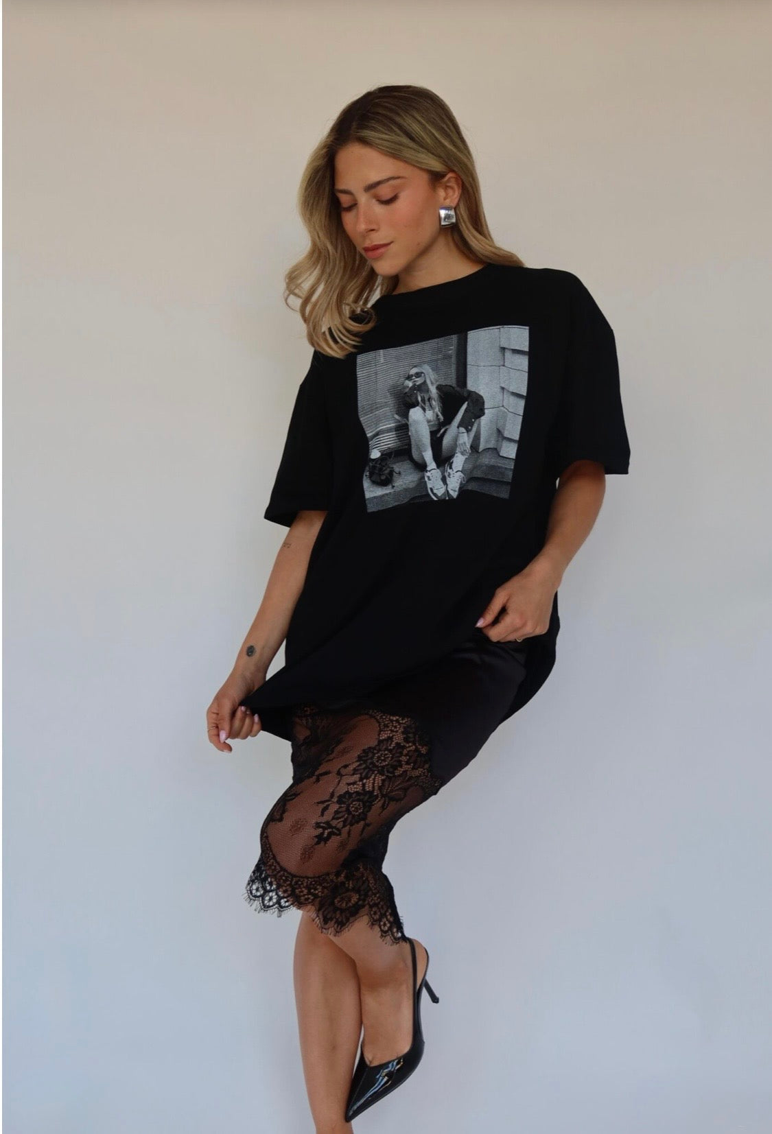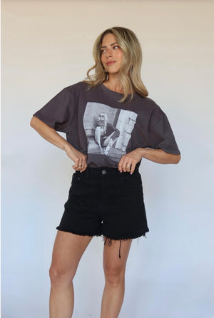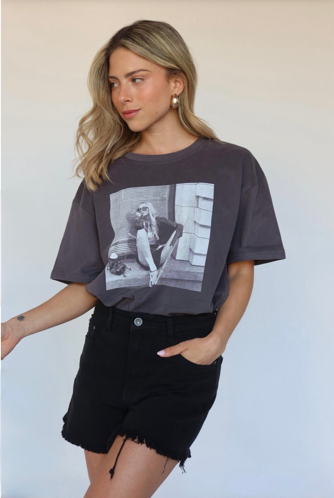 הטופ שבתמונה הוא טי-שירט בגזרת אוברסייז בצבע אפור כהה שחור ולבן עם הדפס צילום בשחור־לבן במרכז החזה. הבד רך ונראה נעים למגע, והחולצה משתלבת בקלות עם ג’ינס או שורטס למראה יומיומי קליל ובעל טאץ’ אורבני