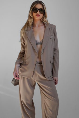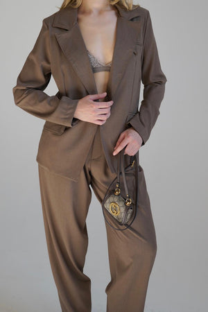 בלייזר בגזרה ארוכה עם רכיסת כפתור, ומכנס לוזי עם כיסים ושרוך לקשירה.