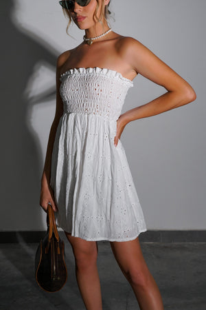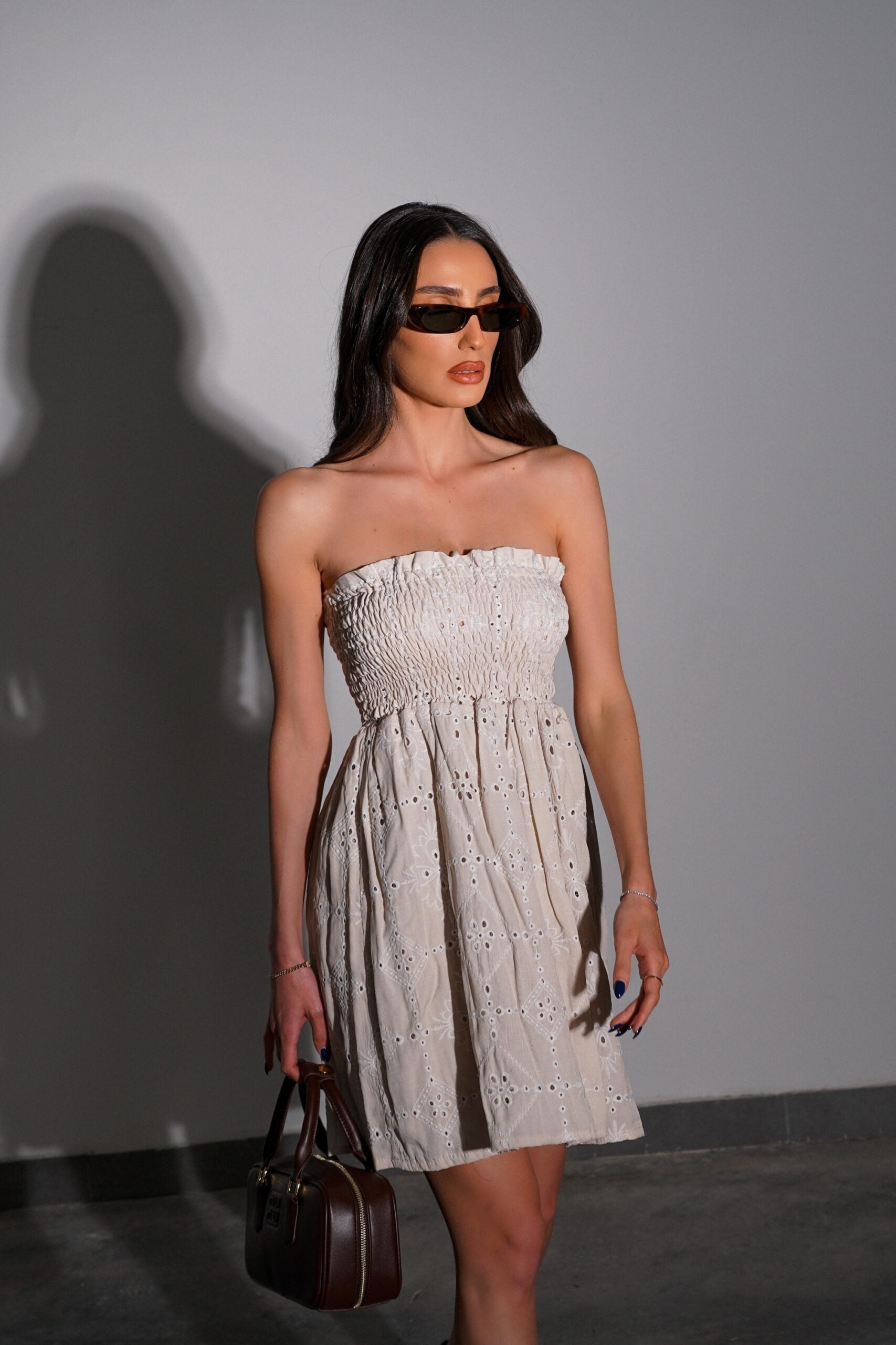 שמלת סטרפלס מיני עם גומי ציפקה בחלק העליון