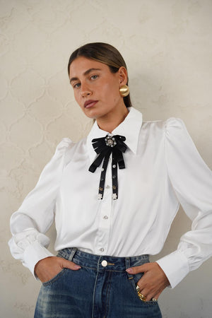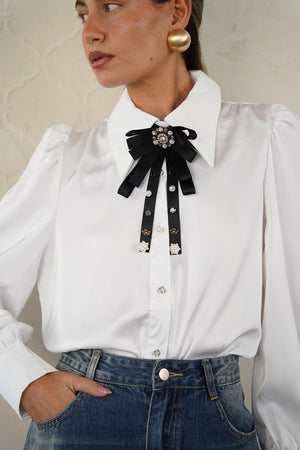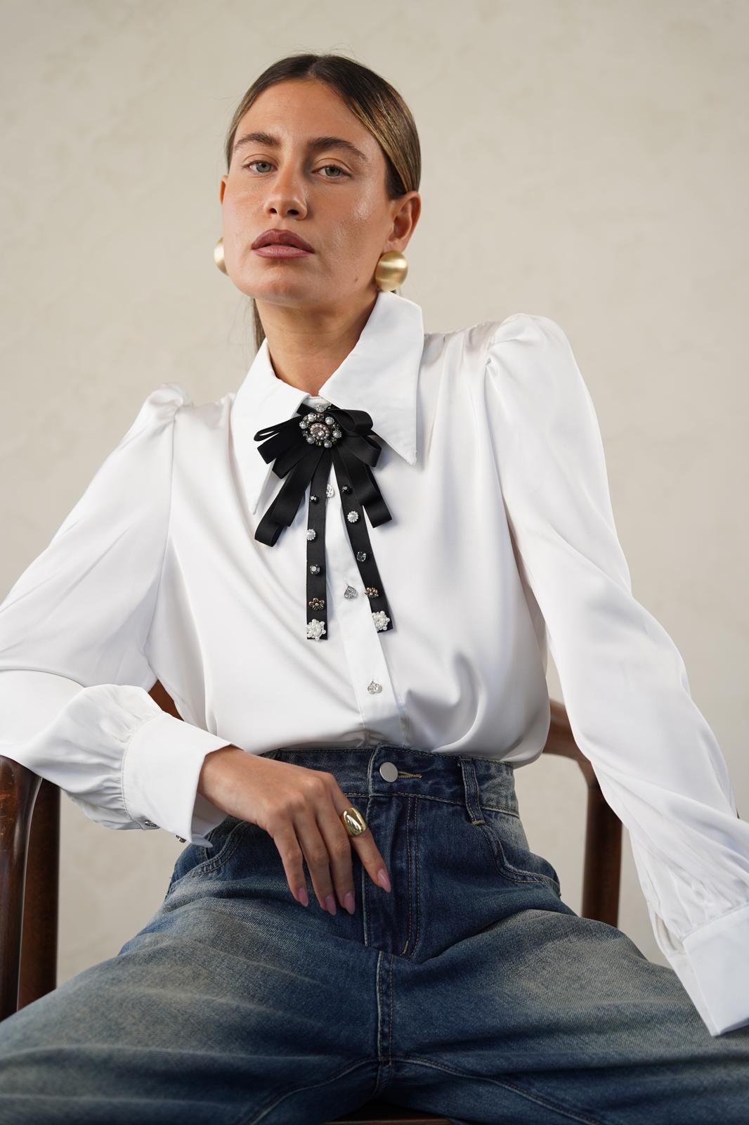 חולצה לבנה עשירה מאוד מבד עם כפתורים ברזל עם אבנים וסיכה (לא מחוברת) עשירה מאוד מאבנים